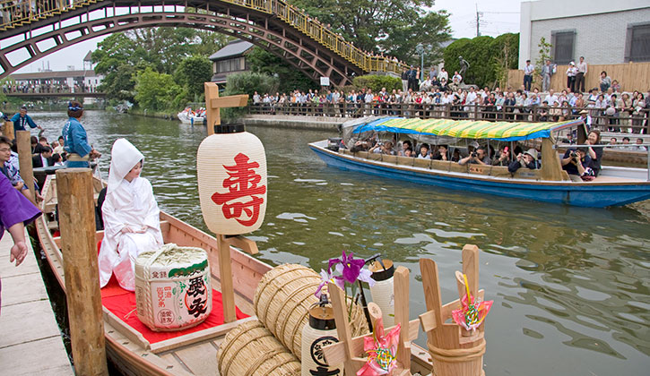 白無垢と伝統的な「嫁入り舟」。神前式による格式高い結婚式をご提案いたします。